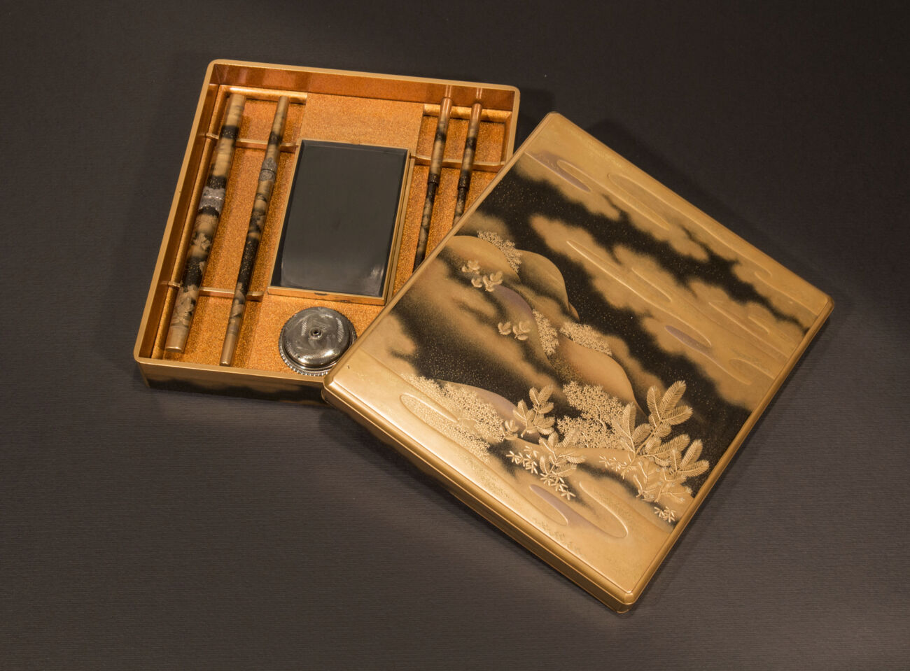 Il secondo contenitore era, invece, destinato a conservare in maniera ordinata strumenti da cancelleria. La fumibako e la ryōshibako presentano uno sfondo con il caratteristico effetto specchio-nero: una superficie nera lucida ottenuta con il rōiro, che prevede l’aggiunta di nero di fuliggine alla lacca. La decorazione dorata può essere hiramakie (piatta) o takamakie (a rilievo), in particolare per i dettagli dei rami o delle foglie.