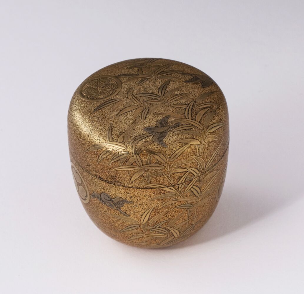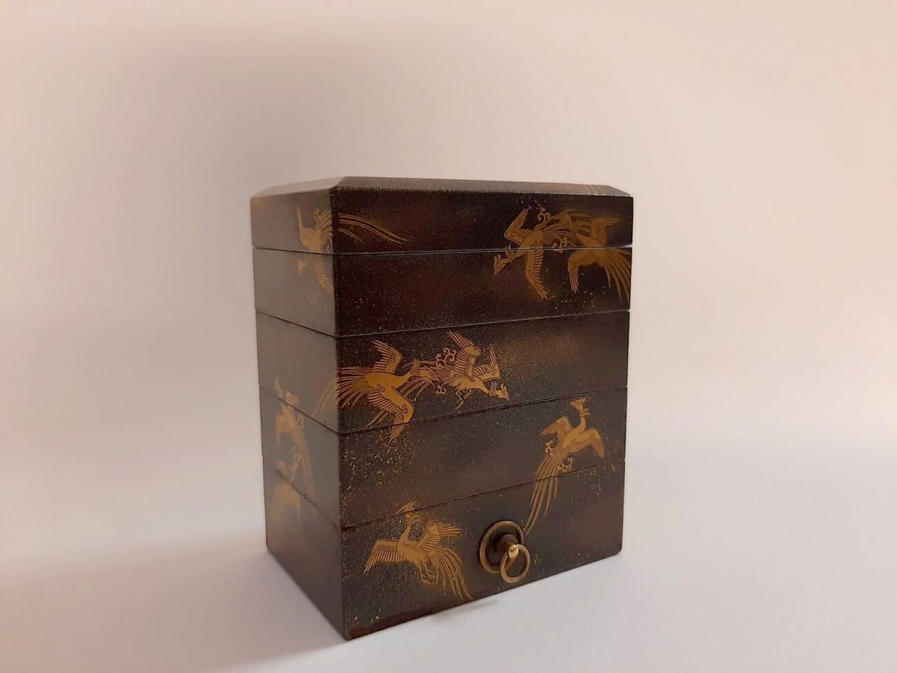 Nel corredo non possono mancare oggetti associati alla cerimonia dell’incenso, in cui la preziosità delle rare e costose sostanze aromatiche viene evidenziata dall’associazione con la lacca dorata. La kasanekōgō a 4 scomparti sovrapposti, fornita di coperchio e piccola maniglia, che si può ammirare nella foto sottostante, è adornata da fenici in volo. Questo uccello mitologico, identificato dagli occidentali con il misterioso Uccello Rosso del Sud, fenghuang (in giapponese hō), era associato all’imperatrice, al lato femminile e al concetto di yin. Ancora adesso rimanda all’idea di matrimonio e prosperità coniugale.