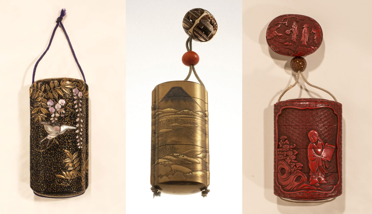 Finemente decorati, gli inrō presentano simboli stagionali, motivi decorativi derivati dai dipinti o temi legati alla tradizione letteraria. Una rondine intarsiata in madreperla vola tra lunghi rami di glicine applicati in porcellana, su sfondo hirame (superficie ricoperta di grani di polvere): entrambi annunciano la bella stagione, in particolare la tarda primavera. Il monte Fuji fa da sfondo a un idilliaco paesaggio agricolo, punteggiato da risaie, boschi e colline; su sfondo fundame (un fondo dorato uniforme e opaco) i diversi piani sono sottolineati dai cambi di spessore della lacca e abbondante uso del kirigane (ritagli di foglia dorata). Dalla Cina viene la storia del giovane Kikujido che, sfamandosi di crisantemi, diventa immortale: coerentemente è associato alla tecnica tsuishu, la lacca rossa intagliata.