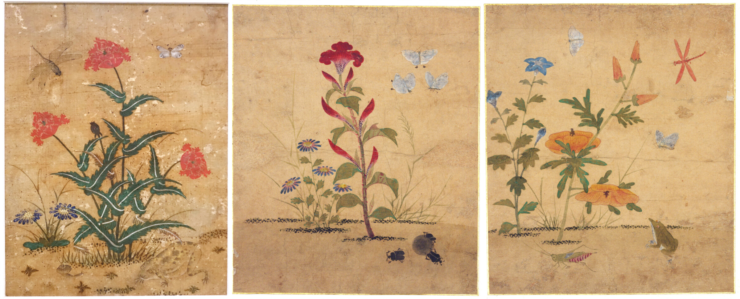 Centro: Ch’och’ungdo intitolato Celosia e scarabeo stercorario, inizio XVI secolo. Museo Nazionale della Corea 국립중앙박물관.