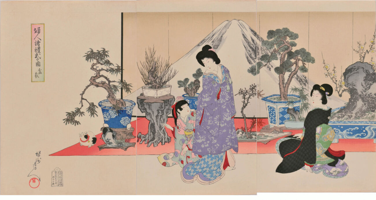 La stampa qui sotto, intitolata “Dipinto di attività femminili - bonsai”, vede protagoniste delle donne intente ad ammirare dei bonsai durante una cerimonia femminile.