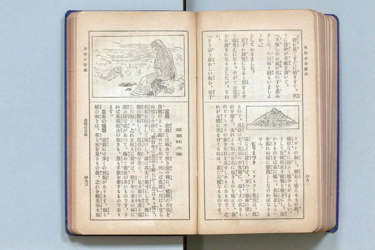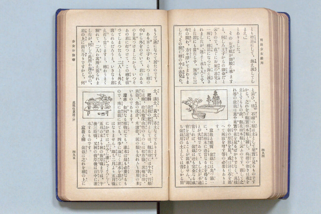 Tra i documenti riguardanti i bonsai di periodo Meiji ve ne sono alcuni inerenti i bambini. Nell'“Enciclopedia per ragazze Meiji”, (figura qui sotto) rivolta alle giovani donne, sono raccolte diverse immagini esplicative. A pagina 4 della stessa, troviamo la dicitura “Metodo di modellatura dei bonsai”.