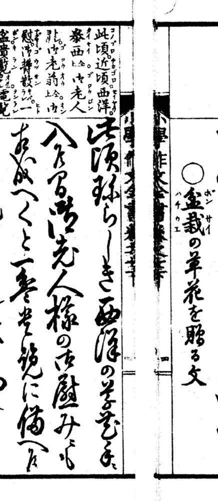 La figura qui sotto illustra una di queste raccolte pubblicata nel 1883. Nell’indice troviamo riportate sia la lettura “bonsai” che “hachiue” per i caratteri che compongono la parola bonsai, un particolare interessante, in quanto deduciamo che la lettura bonsai non si era completamente stabilizzata. La frase recita quanto segue: