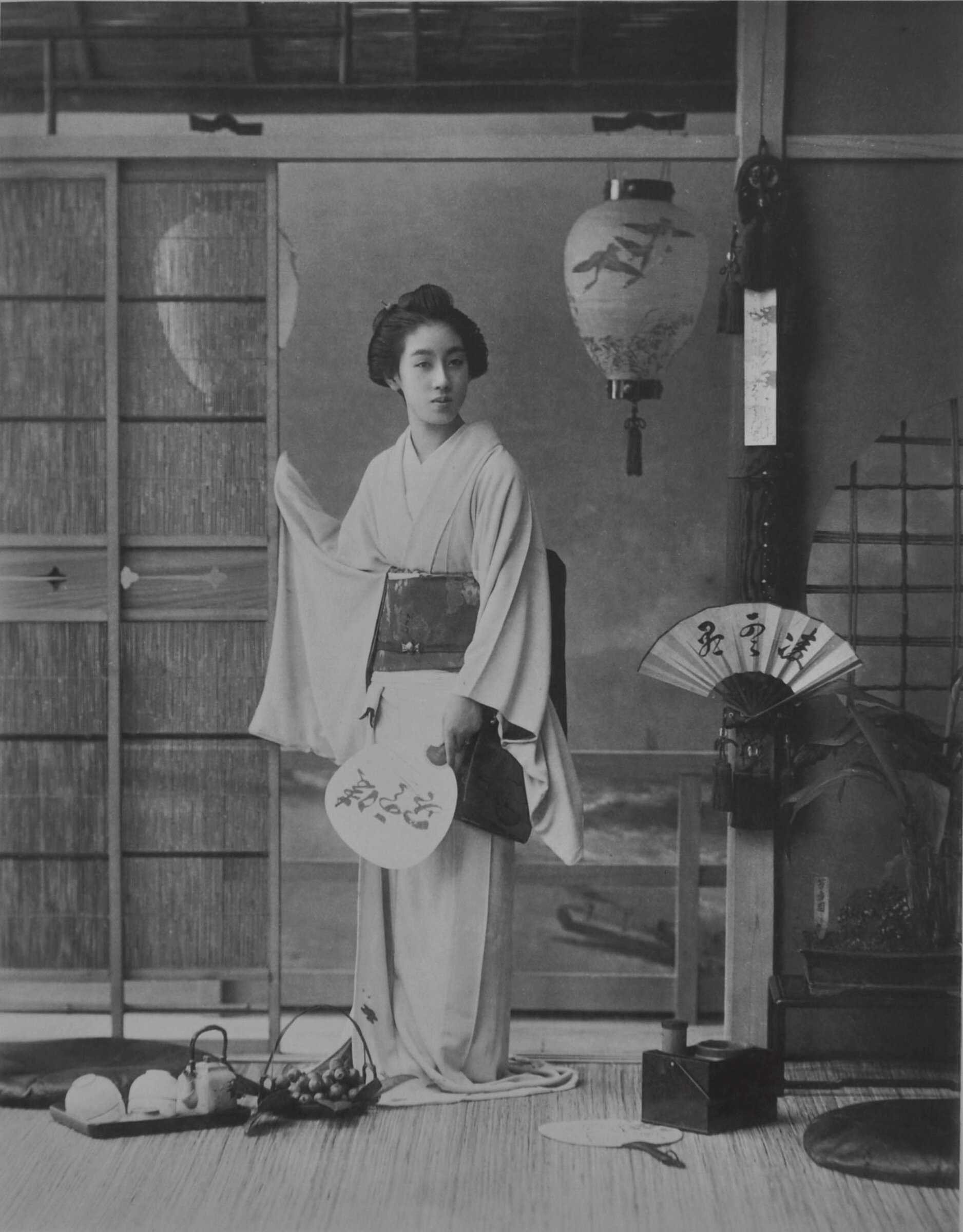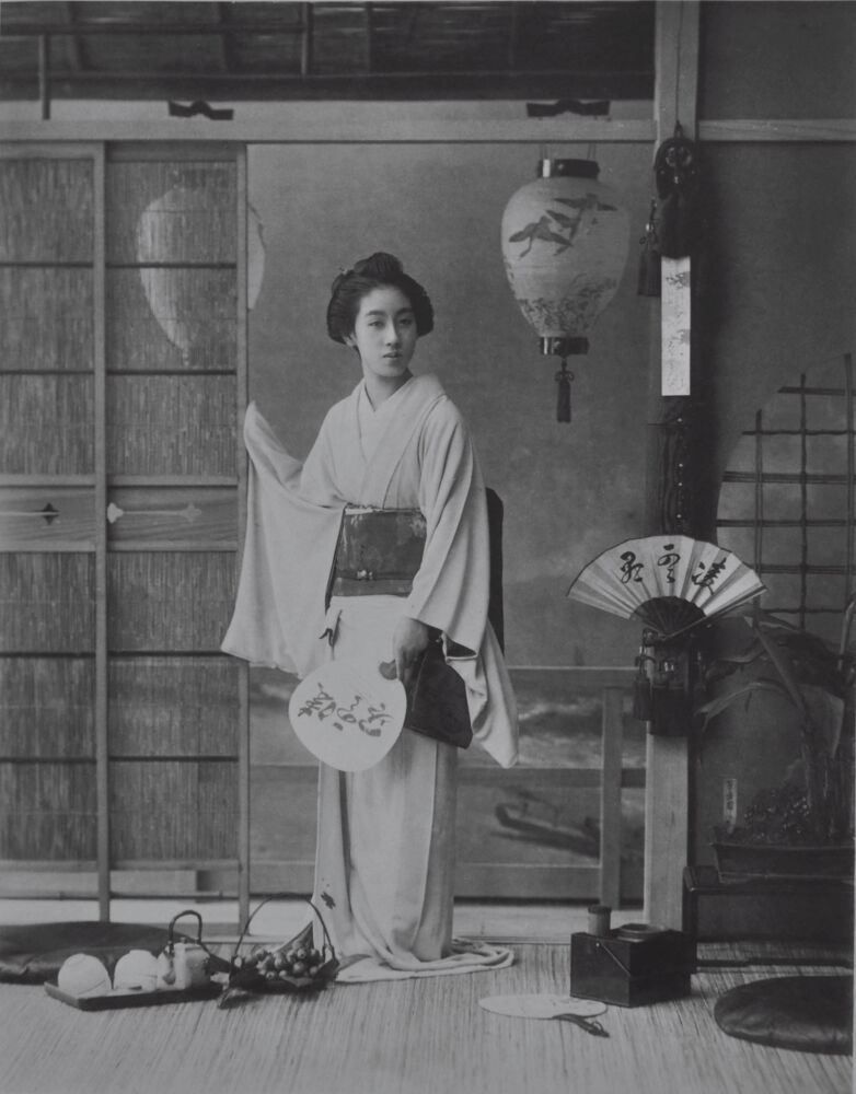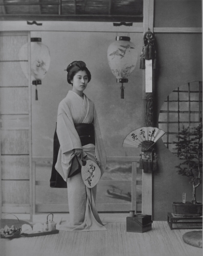 Nelle fotografie qui sotto vediamo ritratte delle donne giapponesi a fianco di alcuni bonsai. Le immagini seguono i canoni compositivi proposti nelle innumerevoli stampe Ukiyo-e che avevano le bellezze femminili come soggetto: delle donne posano con in mano un ventaglio a fianco di alcuni bonsai. Questi venivano spesso inseriti come ornamenti nelle foto-ritratto, proseguendo quella tradizione già iniziata nelle stampe Ukiyo-e.
