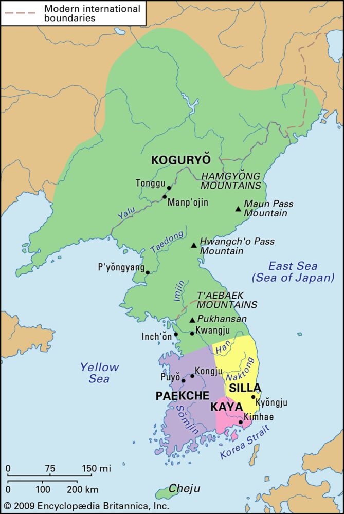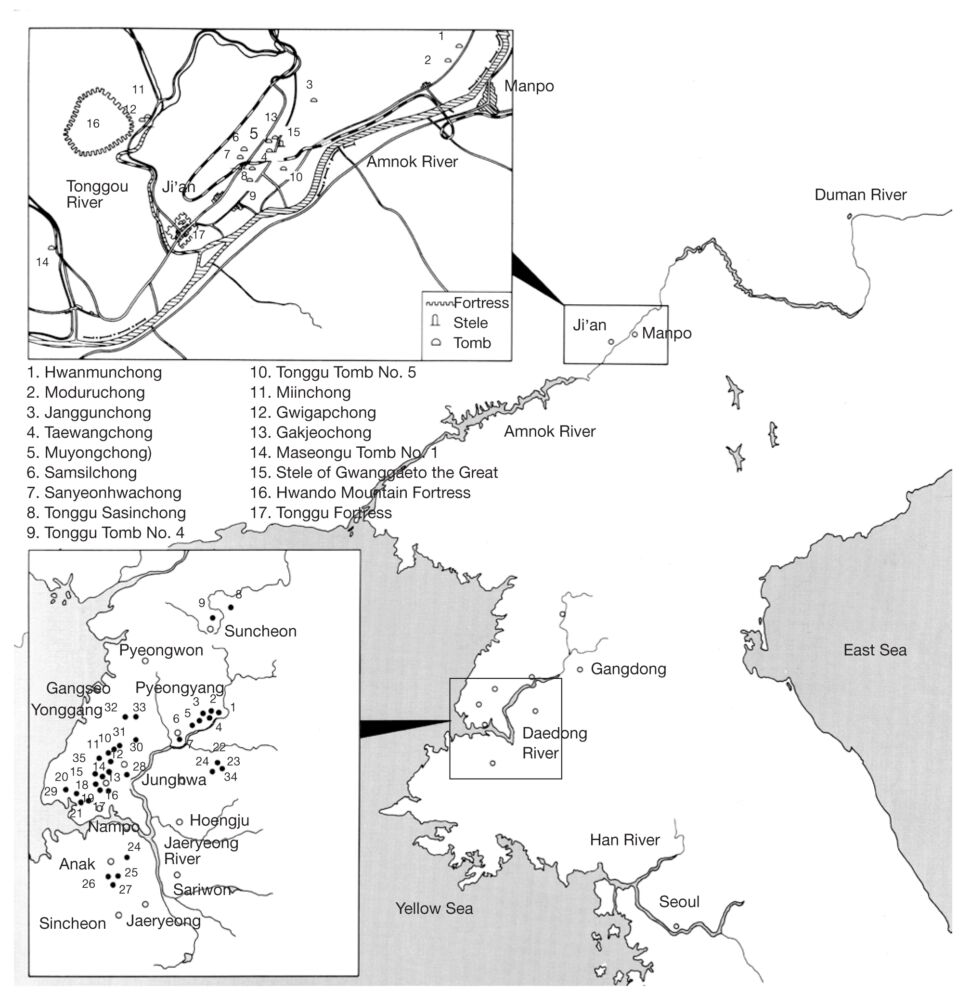 Scritto da -Koguryŏ, rappresenta il più grande dei Tre Regni in cui l'antica Corea era divisa fino al 668 d.C.. Secondo mitiche narrazioni, tradizionalmente il regno di Koguryŏ fu fondato nel 37 a.C., nei pressi del bacino del fiume Tongge nella Corea settentrionale dal leggendario Chumong, capo di una delle tribù Puyŏ.