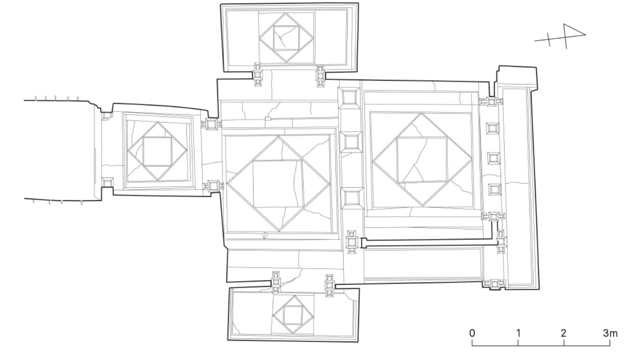 E' una tomba a camera di pietra/tumulo di terra, composta da un ingresso, un'anticamera con due stanze laterali, una a est e una a ovest, e una camera sepolcrale.