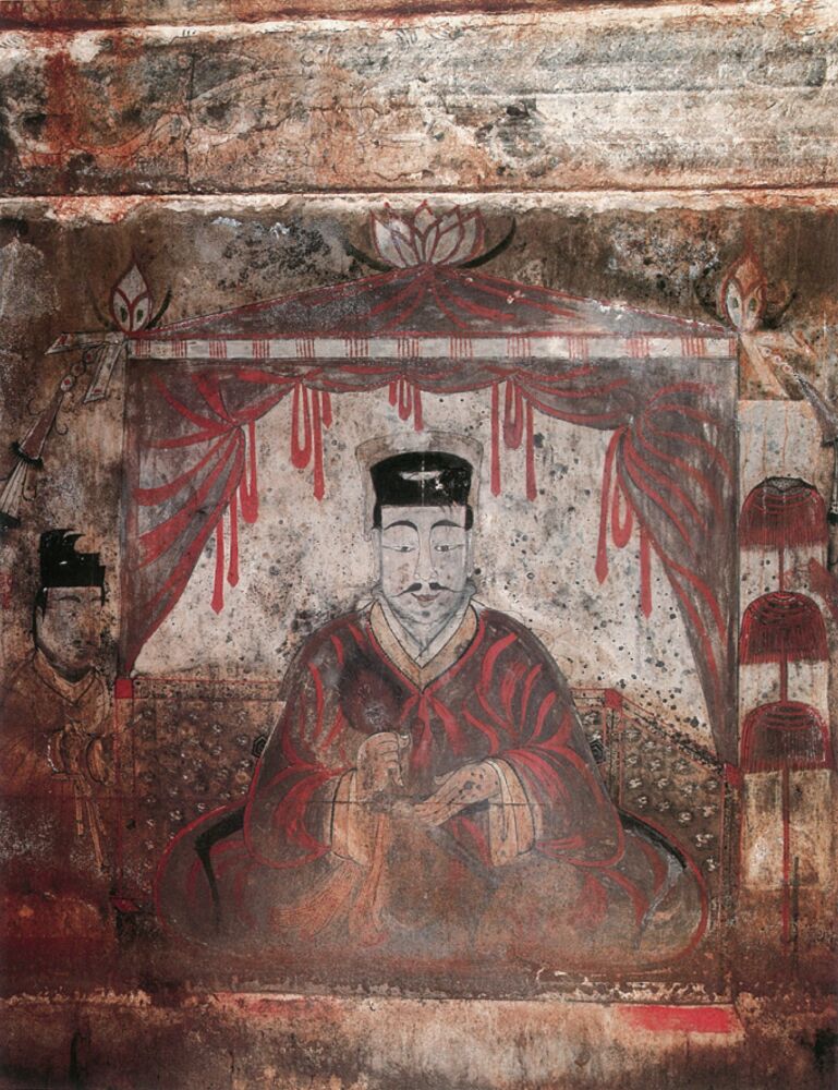 La stanza sul lato ovest vanta i murali più drammatici della tomba, un ritratto del defunto sulla parete ovest e un ritratto di sua moglie sulla parete sud. L'uomo, identificato da un'iscrizione come Dong Shou (coreano Tongsu), siede a gambe incrociate in un baldacchino, le sue spalle oblique e l'ampio spazio tra le ginocchia formano un triangolo. Indossa una veste rossa e il copricapo di seta bianca, che era riservato a un sovrano di Koguryŏ, secondo l'Antico Libro di Tang e tiene un ventaglio piumato nella mano destra.