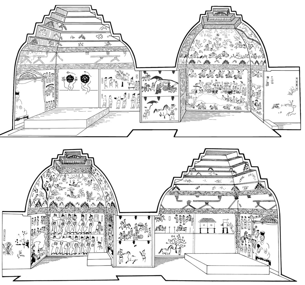 Sul soffitto erano raffigurati il sole, la luna e le stelle, gli immortali taoisti, gli animali mitici, gli uccelli di buon auspicio, le erbe sacre e le nuvole alla deriva per rappresentare il mondo celeste in cui sarebbe entrata l'anima del defunto. Le scene di vita quotidiana raffigurate sulle pareti e il mondo celeste raffigurato sul soffitto si combinavano per creare un microcosmo dell'universo all'interno della tomba. Tali rappresentazioni sembrano derivare dalla convinzione che la ricchezza e la prosperità del defunto si sarebbero estese nell'aldilà.