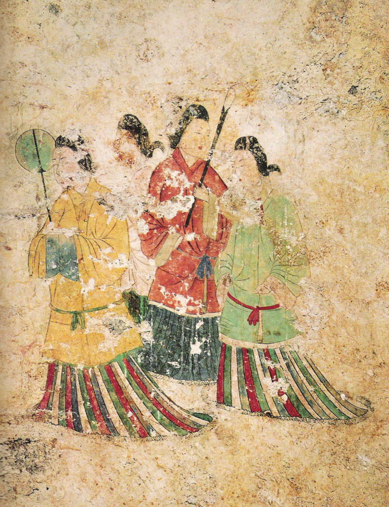 La diffusione del modello cinese si rafforzò ulteriormente durante il regno dell'Imperatore Tenmu 天武天皇 (672-686 d.C.) e di sua moglie, l'Imperatrice Jitō 持統天皇 (687-703 d.C.), la quale gli succedette al trono dopo la sua morte. Durante il loro regno, la corte divenne così ancora una volta un dinamico centro per la fioritura del gusto estetico continentale, stavolta proveniente non solo dalla Cina, ma anche dalla Corea. A offrire una preziosa testimonianza dell'atmosfera che si respirava negli ambienti imperiali di quel periodo è la tomba di Takamatsuzuka 高松塚, edificata alla fine del VII secolo d.C. proprio nell'area di Asuka, nell'odierna prefettura di Nara. Takamatsuzuka fa parte di un complesso funebre formato da una serie di cinque tombe kofun 古墳, ovvero dei tumuli sepolcrali di varie forme utilizzati per diversi secoli per l'inumazione di nobili, capi clan e imperatori, ma venne riportata alla luce solo alla fine degli anni Sessanta del ventesimo secolo. La sua scoperta è considerata ancora oggi di estrema importanza dal punto di vista storico-artistico, in quanto si tratta di uno dei pochissimi esempi dell'arte delle epoche Asuka 飛鳥e Hakuhō 白鳳, arte in cui l'influenza continentale è particolarmente viva. Dalla struttura architettonica agli intonaci, tutto di Takamatsuzuka venne infatti realizzato seguendo quasi esclusivamente tecniche cinesi e coreane, ma ciò che fa veramente capire quanto gli influssi dalla terraferma fossero permeati nel Giappone del VII secolo sono gli affreschi con soggetti umani, raffiguranti con tutta probabilità alcuni membri dell'aristocrazia di corte. Divisi in gruppi di uomini e donne, i cortigiani di Takamatsuzuka sono stati rappresentati con indosso abiti la cui foggia ricalca non quella cinese, ma quella del regno di Koguryō, situato nel nord della penisola coreana. Le figure femminili, in particolare, presentano ancora un buono stato di conservazione tale da permetterne l'analisi.