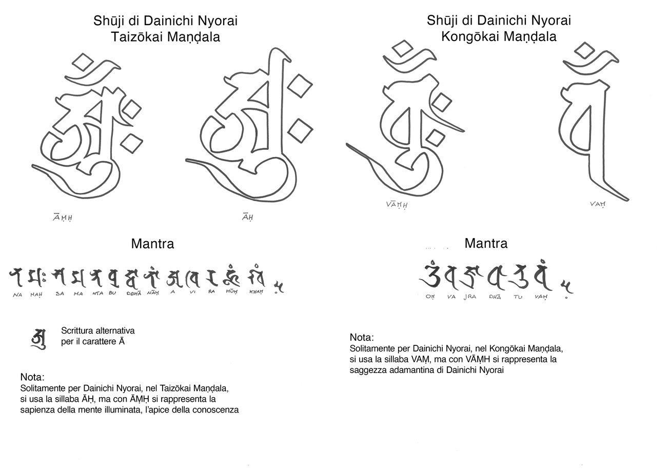 Due dei quattro Shūji - quelli del Maṇḍala del mondo dell’utero contenente le sillabe ĀḤ e ĀṂḤ e quelli del Maṇḍala del mondo di diamante che ha le sillabe VAṂ e VĀṂH - di Dainichi Nyorai è proprio la lettera A, ciò riflette il concetto che ogni cosa nel cosmo è emanazione di Dainichi Nyorai.