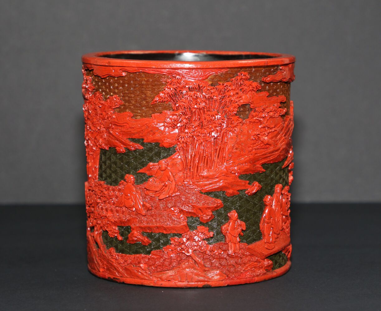 Le lacche cinesi del Museo sono state realizzate tra il XVII e il XIX secolo, a testimonianza di una produzione ininterrotta. Uno sguardo attento rivela una virtuosistica tecnica d’intaglio, che mette in luce i sottostanti strati policromi (rosso alternato a nero), con effetti coloristici che distinguono nettamente il fondo dal rilievo. Il portapennelli nella foto qui sotto ispira il letterato con la raffigurazione dei sette saggi nel bosco di bambù, desiderosi di purificare l’anima attraverso la fuga dal mondo verso la natura incontaminata, secondo la cultura taoista dell’oblio.
