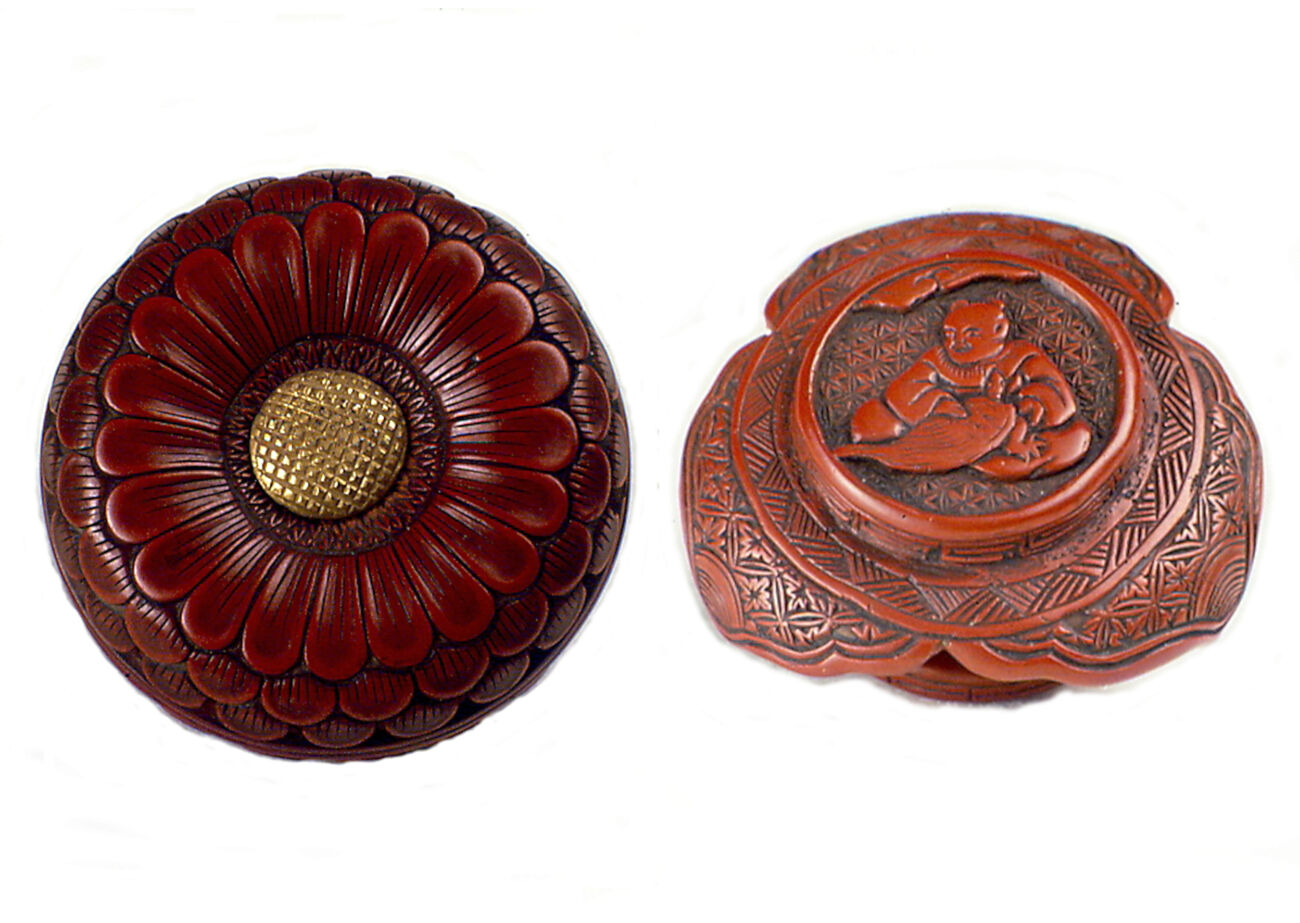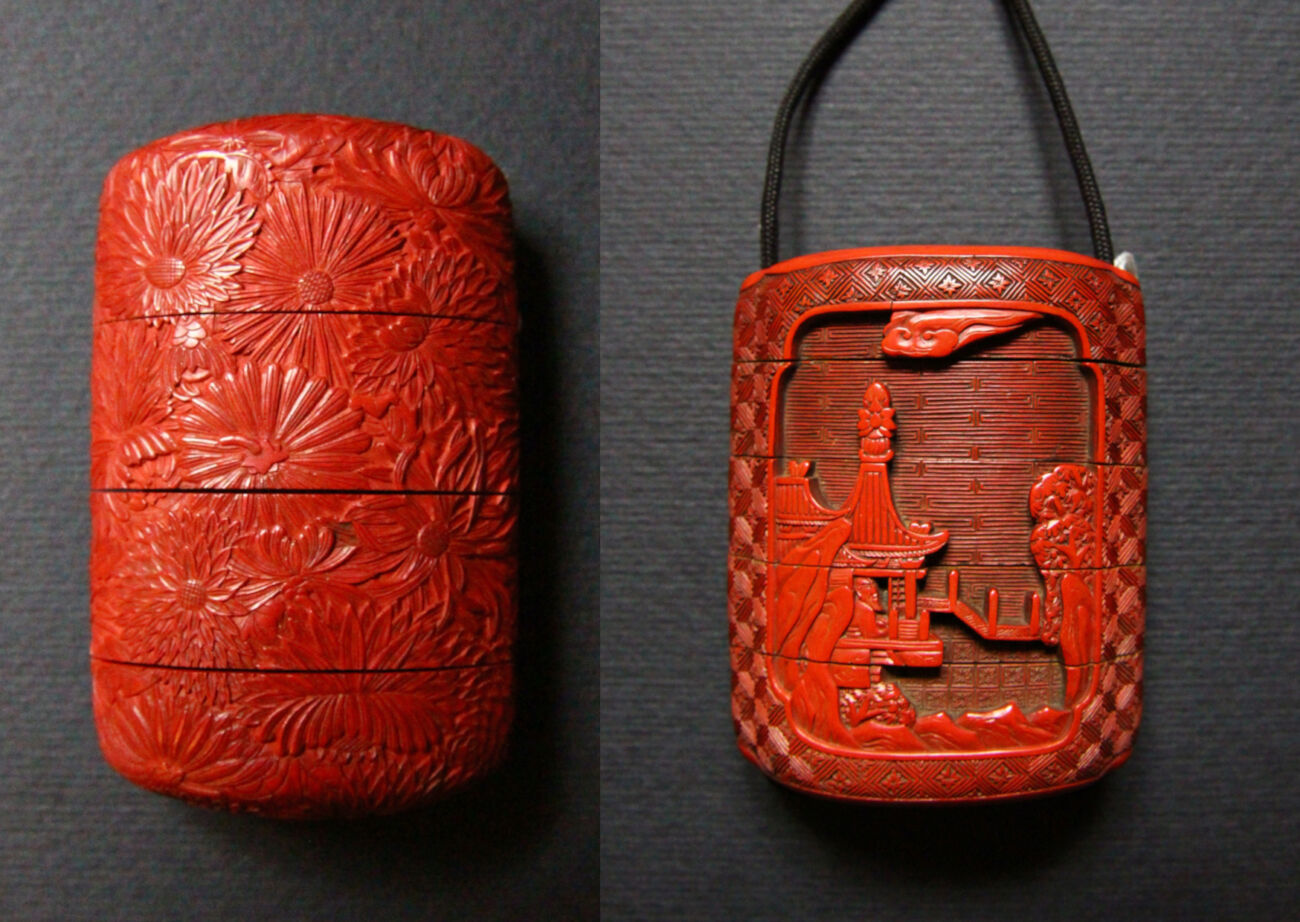 In generale, la lacca intagliata non raggiunse mai la popolarità del makie in Giappone, né tantomeno la sua perfezione artigianale. Il passaggio della tecnica tra i due paesi comportò anche una diversa declinazione stilistica: i giapponesi prediligevano nettamente l’uso del solo rosso all’alternanza di vari colori. Inoltre, il suo utilizzo, pensato in Cina per suppellettili, piccoli mobili anche per i templi e piedistalli di sculture, cofanetti, scatole e vassoi, si restrinse a oggetti di piccole dimensioni. Ciò è testimoniato dagli oggetti conservati in Museo, nella sala IX e nella X: una ventina tra inrō e netsuke, le scatoline portaerbe a scomparti e i loro contrappesi.