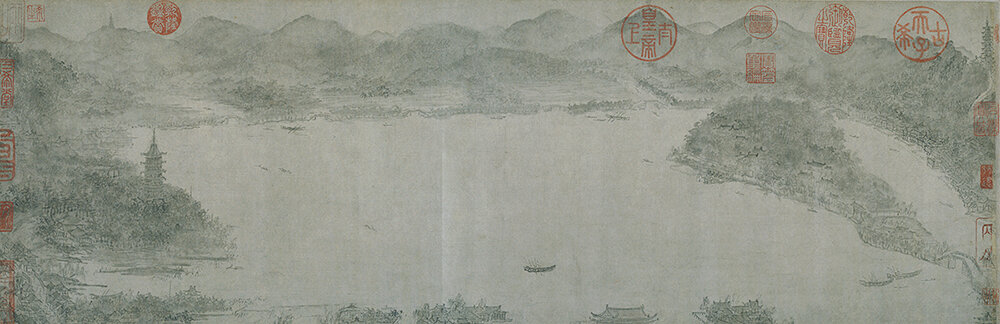 Diversi erano i formati adibiti a raffigurare il lago e variavano in relazione all’utilizzo e all’esperienza visuale che l’artista voleva offrire all’osservatore. Tra le tipologie principali vi erano la vista a volo d’uccello e le cosiddette Xihu shi jing 西湖十景 (Dieci Vedute del Lago Occidentale). La prima tipologia era dedicata ai rotoli orizzontali, che permettevano di catturare la visione panoramica dello scenario ed erano in grado di assorbire in un unico sguardo una distanza che andava oltre ciò che l’occhio umano era in grado di percepire. Alcuni di questi esempi, tra cui il dipinto Lago Occidentale del pittore Li Song 李嵩 (attivo tra il 1190 e il 1230) presso lo Shanghai Museum, si ispirano chiaramente all’impostazione strutturale che veniva utilizzata per la creazione di dijing地經 (mappe) in cui il lago e la città di Hangzhou erano raffigurati dal punto di vista imperiale, ovvero con una prospettiva che dalla capitale posta in basso, guardava verso il lago.