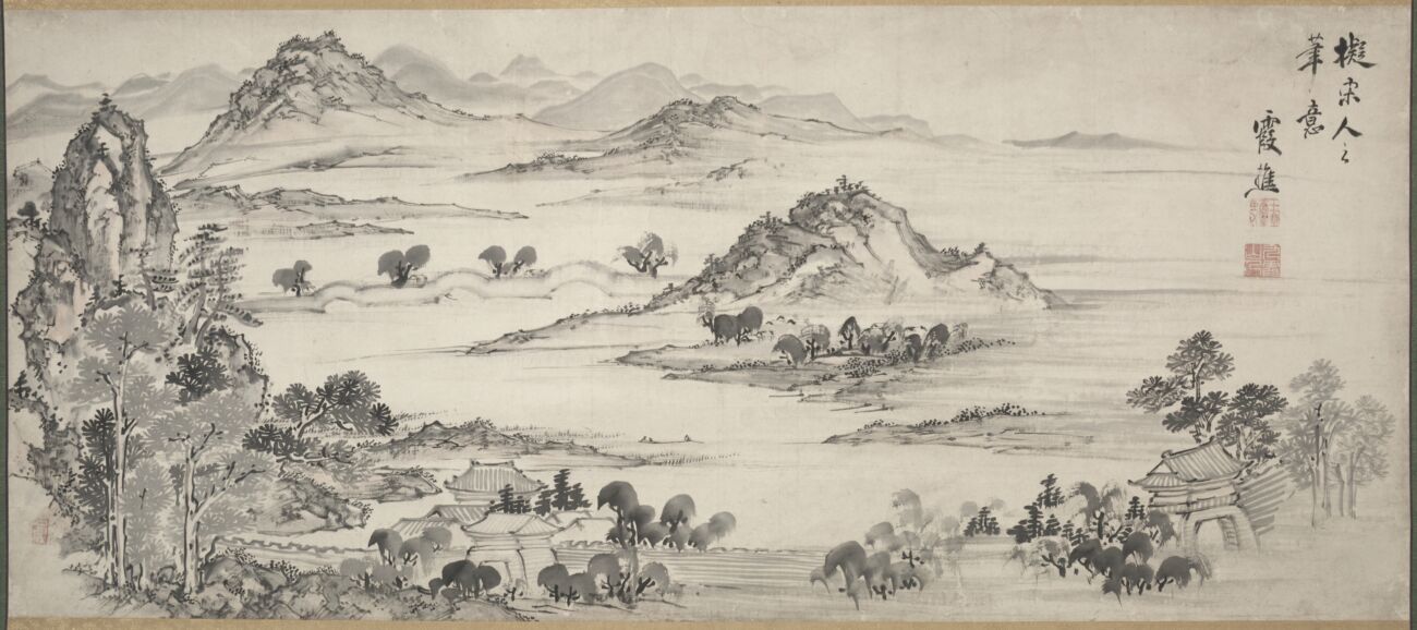 Il Lago Occidentale rappresentava per gli artisti giapponesi e in particolare per i pittori nanga il soggetto esemplare tra i luoghi celebri del regno di mezzo come simbolo dell’apice della cultura. In Veduta del Lago Occidentale di Ike Taiga di inizio XVIII secolo esposto al Cleveland Museum of Art, l’artista reinterpreta il lago basandosi su una stampa xilografica presente nel libro Tianxia mingshan tu 天下名山圖 (Montagne Famose in Cina) del 1633. Si tratta di un’opera in cui l’artista unisce elementi legati alla pittura tradizionale cinese che erano cari alla scuola meridionale, come lo stile di Juran 巨然 (attivo nel X secolo) o la tecnica della pittura a inchiostro puntinata, che erano stati popolarizzati dai manuali importati, e l’intuizione personale che lo porterà negli anni a calibrare la tradizione della pittura cinese con la ricerca del shinkeizu 真景図, ovvero della veduta reale come modo di osservare il paesaggio giapponese.