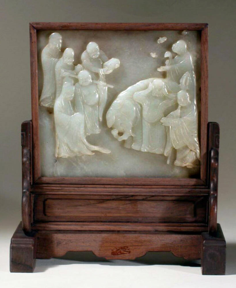 Gli oggetti che troviamo nella collezione statale veneziana ci aprono una finestra sul mondo raffinato e colto dei letterati cinesi di XVIII e XIX secolo: un articolo che senza dubbio trovava posto sul loro tavolo da studio è il piccolo paravento (cm. 22,5 x 22), realizzato con un sottile schermo di giada bianca con una scena a bassorilievo montata su un supporto ligneo. Questi tipi di pannelli decorativi, che proteggevano i fogli e gli strumenti da scrittura posati sulla scrivania, ma che potevano anche decorare i lati di un divano o di un trono in un palazzo o essere posti ai lati dei capifamiglia, erano di solito realizzati in coppia, ed erano assai apprezzati per la naturalezza del loro materiale, per il colore puro che si lasciava attraversare dalla luce, per la decorazione ispirata a scene di palazzo o a paesaggi: dei veri e propri dipinti scolpiti, che portavano la Natura tra le mura domestiche.