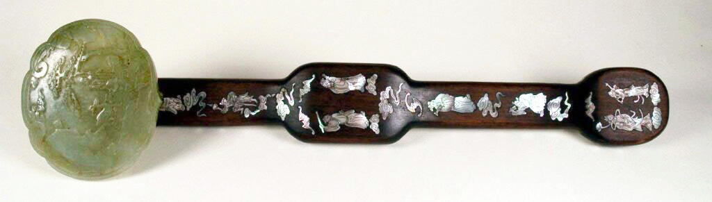 Il già citato scettro ruyi conclude questa breve analisi ed esemplifica la straordinarietà della collezione di giade qui illustrata: il ruyi, nato in ambiente taoista, rappresentava nella sua forma il flusso della Via (Dao), e nel tempo diviene un simbolo di saggezza legato anche al mondo buddhista. Poteva essere dato in dono con l’intento di augurare successo, benessere o per congratularsi per importanti obiettivi raggiunti10. L’esemplare veneziano riprende nella forma e nella fattura il modello tradizionale: un manico in legno a doppio arco, su cui si innesta la testa in giada a forma di fungo lingzhi, decorata con una scena scolpita. Ad arricchire il manico, piccole figure di Saggi e Immortali ed elementi del mondo letterario intarsiati in madreperla, che caricano ulteriormente il potente valore di questo oggetto quasi sacro, magico e affascinante come gli altri pezzi raccolti nella vetrina posta al centro della sala cinese.
