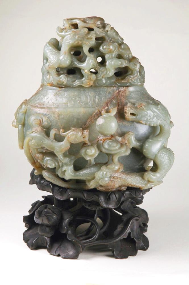 Splendidi anche i bruciaprofumi, con un ricco ed elaborato decoro a traforo, o circondati da creature zoomorfe e draghi, che coniugano all’eleganza della loro fattura il mistico potere del fumo profumato che si innalza nell’aria tra volute più o meno dense, coinvolgendo tutti i sensi e alludendo al ciclo naturale della vita e del Dao. Queste coppe brucia-incenso, come le altre coppette, le brocche e i versatoi, ripropongono nella loro forma i modelli del più antico vasellame in ceramica e in bronzo, così come i bassorilievi che impreziosiscono la loro superficie richiamano fiere stilizzate, animali portafortuna, onde e nuvole, patterns tradizionali e di buon auspicio9. Interessante osservare la diversità del materiale con cui sono realizzati questi esemplari: troviamo infatti pezzi color verde cupo, attraversati da ampie inclusioni brunastre, che contrastano e mettono in risalto la tinta densa e marezzata dei blocchi scolpiti, accanto ad altri caratterizzati da una varietà di minerale bianca e lucida, la cui superficie liscia e priva di imperfezioni ricorda quasi il vetro.