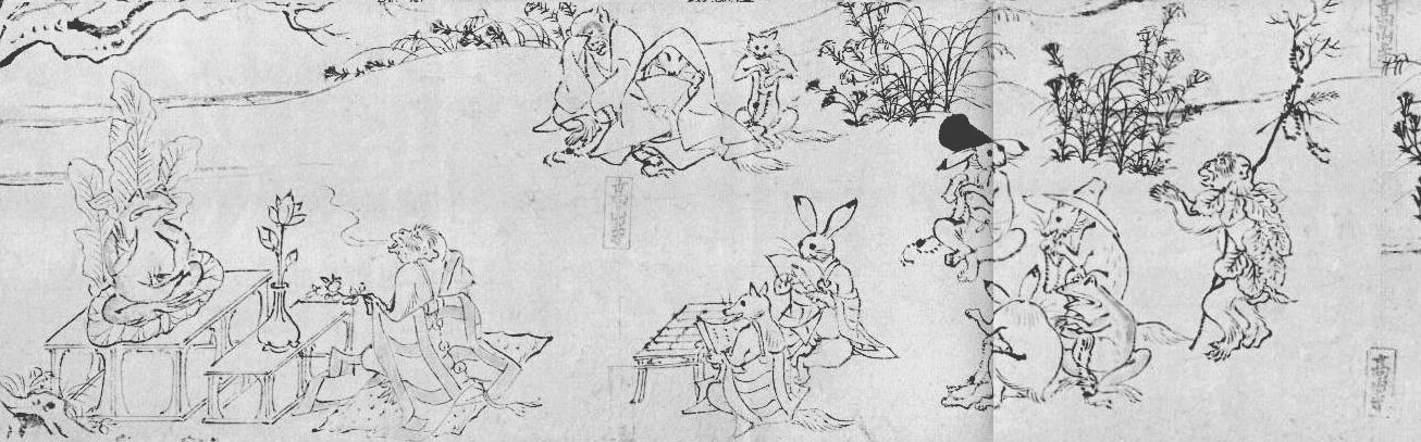 Il primo rotolo (vedi figura sotto) si conclude con una cerimonia con personaggi in semicerchio dietro una scimmia addobbata da monaco, posta di fronte ad un altare su cui è stata tronizzata una rana: si tratta di una vera e propria critica al clero buddhista.