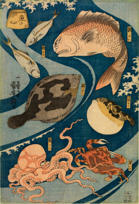 L'appropriazione di immagini tratte dal folklore e dalla tradizione fece sì che gli artisti esplorassero un immaginario soprannaturale che si ritrova sia nelle stampe che in altre forme d’arte come la letteratura popolare, il teatro, i netsuke e l'artigianato inrō. Un esempio molto divertente è questa stampa di Utagawa Kuniyoshi (1798-1861), Le menti dei pesci (Uo no kokoro) del 1842 (vedi figura sotto). Essa mostra una serie di pesci di varie razze e dimensioni con tratti facciali umani e in particolare identificati come alcuni dei più famosi attori kabuki dell'epoca, come Nakamura Utaemon IV in alto, Iwai Shijaku (la passera) e Arashi Isaburō II (il polpo). La mancanza di segni di riconoscimento come gli stemmi suggerisce che quest'opera è datata dopo il divieto del 1842, quando la censura governativa era al suo apice.