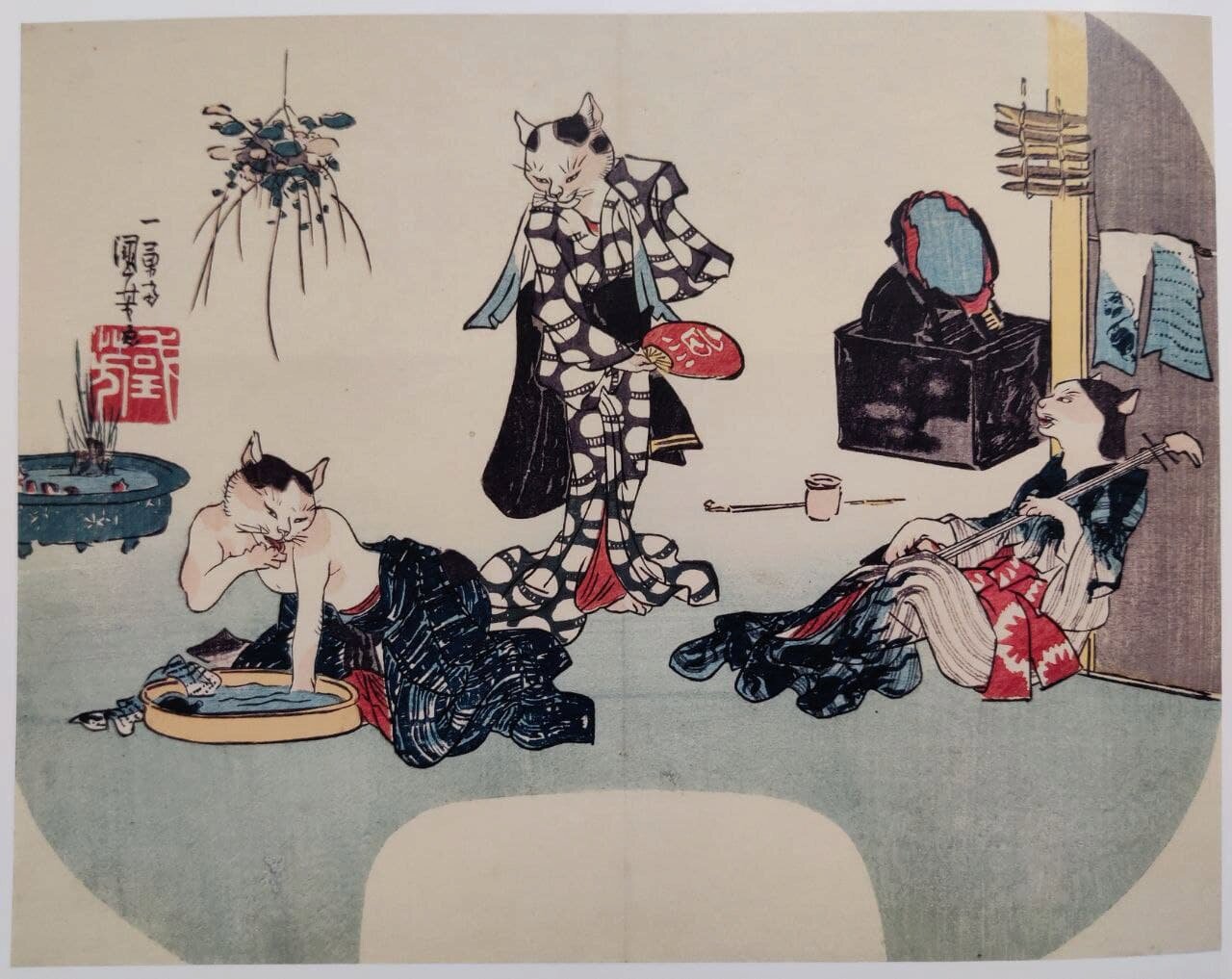 L’espediente dell'antropomorfismo veniva utilizzato per la raffigurazione sia degli attori kabuki dell’epoca sia delle geisha, come in Gatte antropomorfe che si rilassano in estate (Yonaoshi namazu no nasake) (vedi figura sotto), dove tre figure femminili sono state trasformate dall’artista Kuniyoshi (1798-1861) in tre gatte: la prima canta languidamente e suona lo shamisen, la seconda agita il ventaglio raffigurante il carattere sakana (pesce) e la terza è in procinto di lavarsi: questo splendido uchiwa-e sembra essere una reiterazione del genere degli abuna-e, o "quadri pericolosi", già emerso dopo le riforme Kyōhō con il divieto di soggetti erotici espliciti.