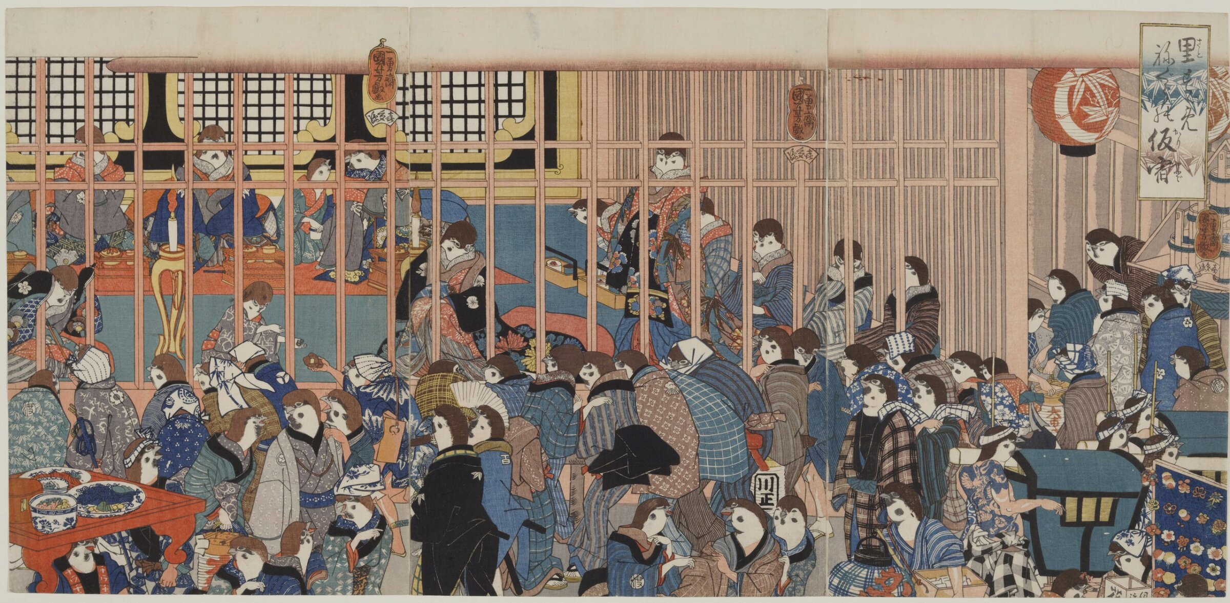 Anche i soggetti raffiguranti i quartieri di piacere furono reinterpretati attraverso l'uso di animali antropomorfi, come nell'esempio nella figura sotto, anch'esso realizzato da Kuniyoshi, ma del 1846, quando gli effetti delle riforme Tenpō erano ancora ben visibili. Passeri del villaggio: rifugio temporaneo nel nido (Sato suzume negura no kariyado) è un trittico ōban presentato quando le scene di prostitute e geisha erano vietate. Diversi uomini raffigurati come passeri si affacciano sulla harimise (stanza con facciata a griglia) dove le cortigiane adornate nei loro abiti siedono con i set da fumo davanti a loro. Tra la folla di uomini-uccello, c'è un banchetto sulla sinistra e alcuni tra loro con la pelle ricoperta di tatuaggi (anch'essi vietati all’epoca) trasportano un palanchino. Si tratta probabilmente di un quartiere temporaneo istituito dalle autorità in attesa della ricostruzione del quartiere principale di Yoshiwara, distrutto da un incendio nel 1845. Il sigillo del nanushi Watanabe Shōemon creò non pochi problemi a quest'opera: essendo posto sulle vesti di alcuni dei personaggi rappresentati, fu interpretato come una mancanza di serietà e portò al licenziamento del censore stesso.