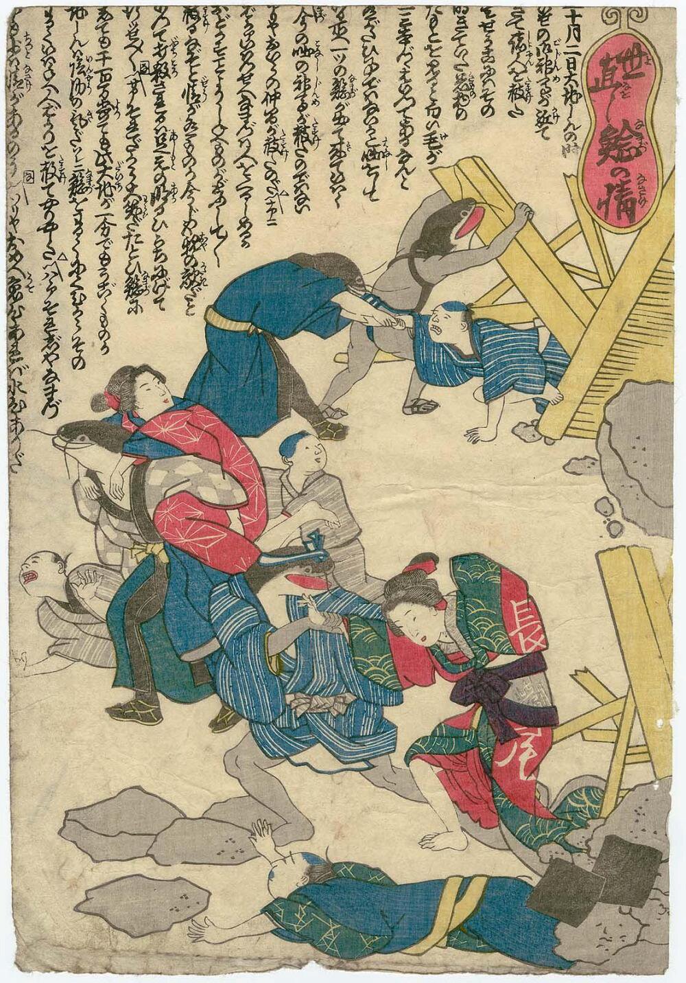 Il mezzo della parodia e degli animali umanizzati fu esplorato anche per affrontare eventi di attualità, la cui rappresentazione rimaneva illegale per le autorità. La maggior parte di queste stampe, infatti, rimase anonima perché, nonostante la sua natura allegorica, violava la legge. Ne sono un esempio le cosiddette stampe namazu-e, o immagini di pesci gatto: si tratta di immagini raffiguranti il terremoto di Ansei del 1855 in cui l'evento è personificato attraverso un pesce gatto. Si tratta di un riferimento alla credenza tradizionale secondo cui i terremoti erano causati dai movimenti di giganteschi pesci gatto nel sottosuolo e la divinità shintoista Kashima Daimyo-jin era in grado di calmare il terremoto schiacciandoli.