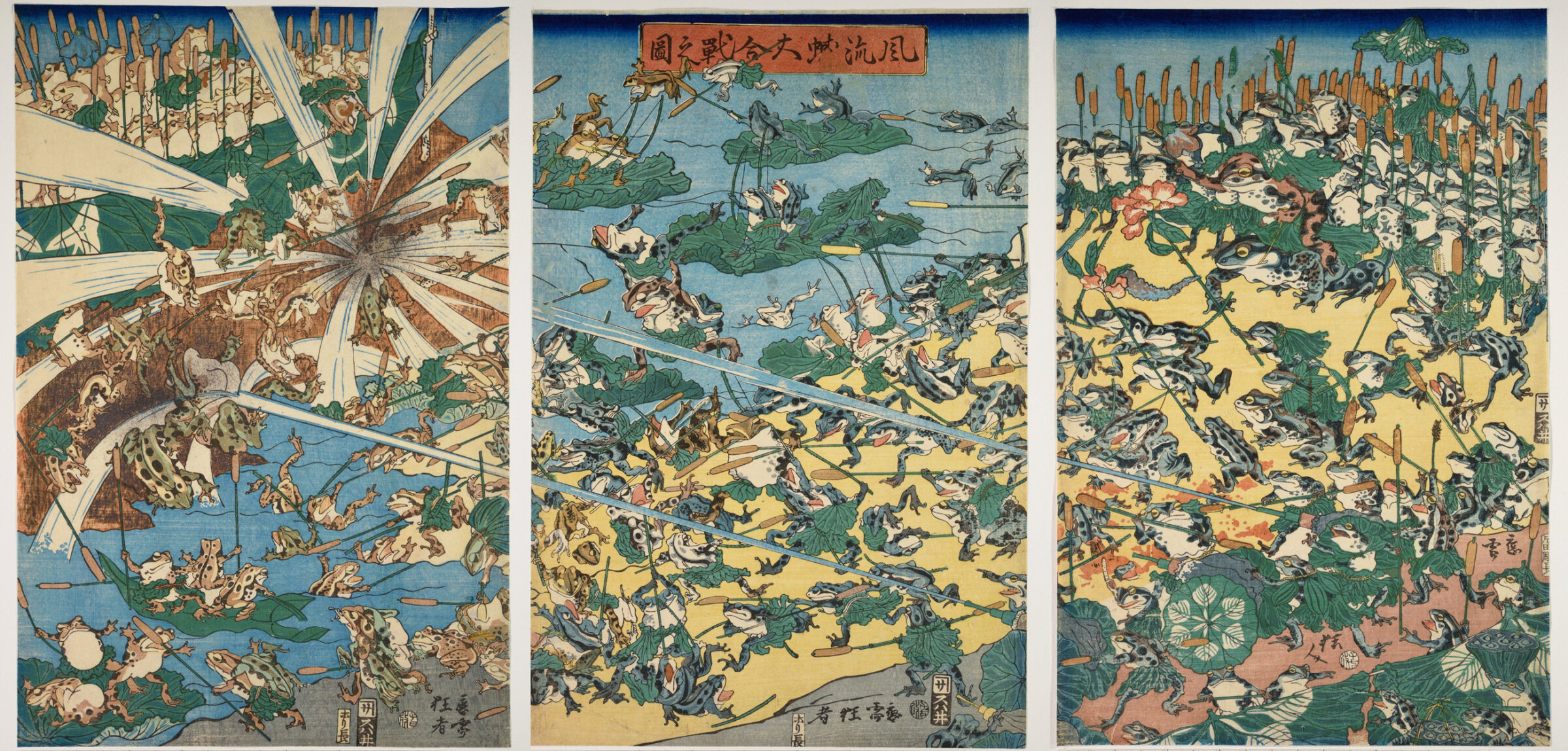Infine, un altro tipo di stampa per cui si ricorreva alla "parodia animale" riguardava il divieto di menzionare la famiglia Tokugawa. Nel trittico del 1864 Elegante immagine della grande battaglia di rane (Fūryū kaeru ōgassen no zu) di Kawanabe Kyōsai (1831-1889) (vedi figura sotto), è raffigurata una battaglia di rane come chiara rappresentazione del conflitto tra lo shogunato Tokugawa e i samurai della provincia di Chōshū. Questa stampa fu censurata dal governo perché prendeva in giro lo stemma dello shogun: è interessante notare come la composizione dia la sensazione di una grande guerra in corso, ma osservando con attenzione i vari dettagli è possibile notare che ci sono alcune rane accovacciate come se fossero dei veri e propri animali, mentre altre combattono con steli di loto usati come lance e spade, e fanno movimenti da veri soldati.