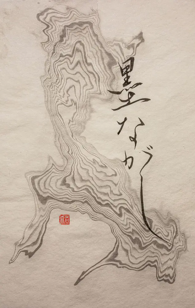 L’acqua, che nella cultura shintoista rappresenta la purificazione, è l’elemento che permette alle fibre di legarsi fra loro a formare il foglio di carta, ma consente anche il trasporto delle tracce dell’inchiostro nel suminagashi. La via degli dei si esprime quindi pienamente nella via dell’acqua e dell’inchiostro, ancor prima di esprimersi nel modo più strutturato e rigoroso che sarà proprio del buddhismo zen. Al modo di vivere shintoista, dove il rapporto con i kami è simile a quello tra gli uomini in un continuo dialogo legato alle stagioni, alla coltivazione del riso, alle necessità del quotidiano, ma soprattutto alla vita reale in tutte le sue forme espressive, si contrappone la concezione buddhista.