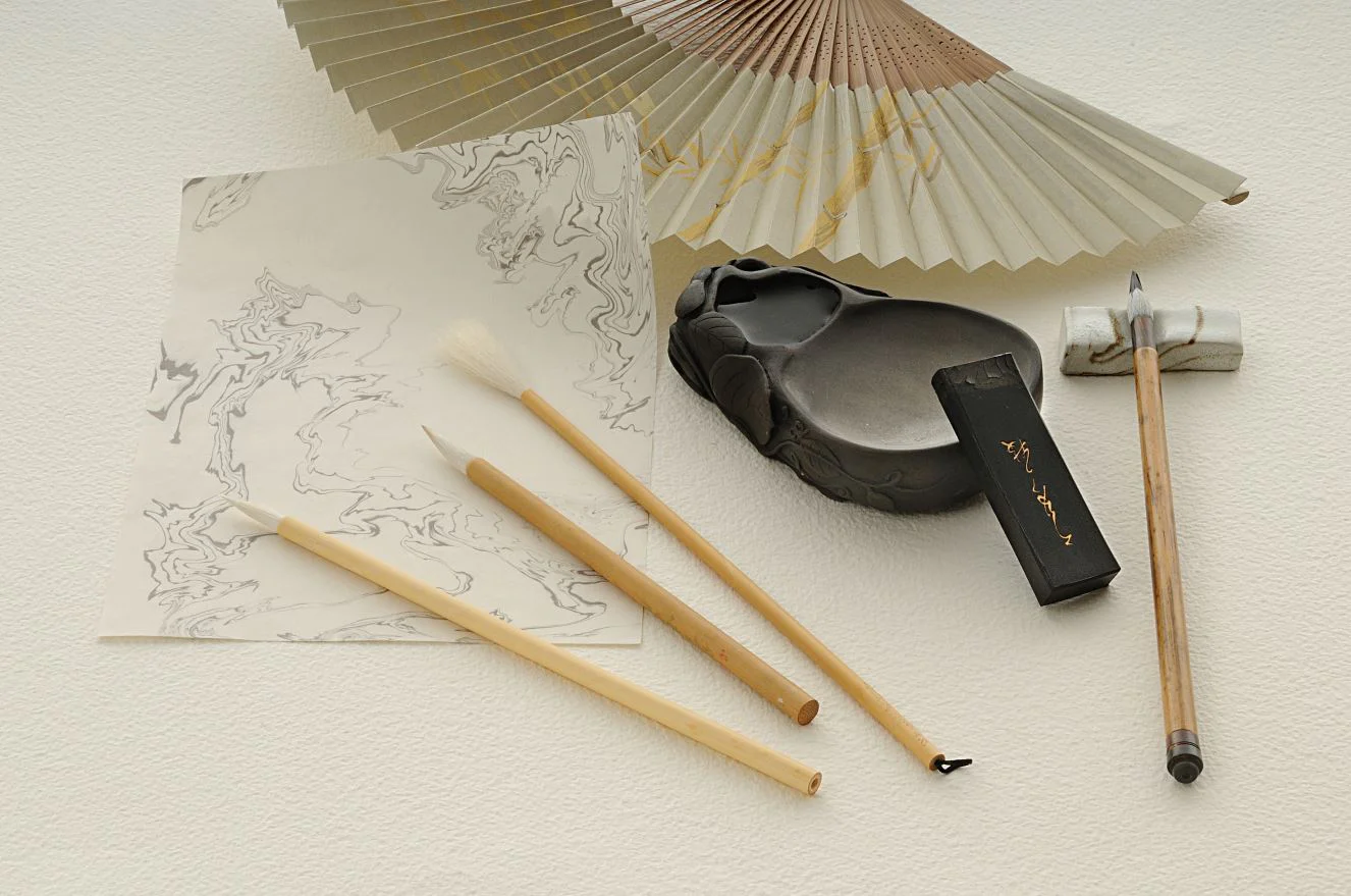 Si usano gli stessi materiali della calligrafia e della pittura a pennello, i 4 Tesori del calligrafo: sumi, un bastoncino solido di polvere di carbone mescolata a resine di pino, suzuri, una tavoletta di ardesia scavata dove mettere poche gocce d’acqua, fude, il pennello di setole morbide per raccogliere l’inchiostro e appoggiarlo sull’acqua, kami, il foglio di carta da porre sul disegno per assorbire ogni traccia fluttuante.