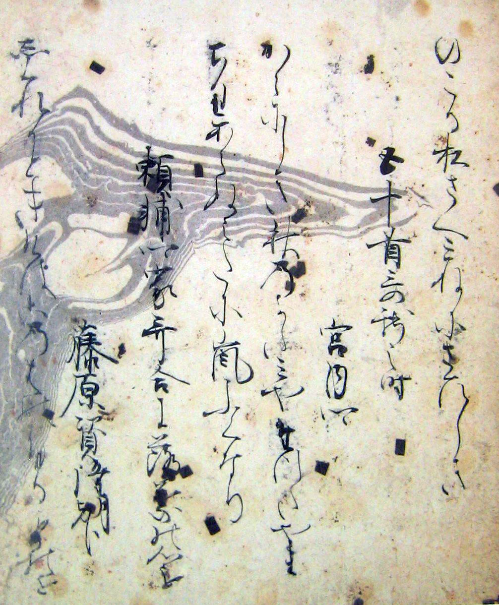 Probabilmente questi primi esemplari furono prodotti dalla famiglia Hiroba, che poi per 35 generazioni lavorò per la corte imperiale. La storia di questa famiglia si intreccia con la leggenda che racconta l’origine del suminagashi come di un dono fatto ai fabbricanti di carta dalla dea Kawakami. La realtà storica ci riferisce che fu il poeta Michizane, maestro di scrittura a pennello, ad accorgersi che le macchie di inchiostro sull’acqua galleggiavano formando disegni affascinanti. Michizane venne ingiustamente esiliato per crimini mai commessi e dopo la sua morte l’imperatore lo riabilitò nominandolo Tenjin (divinità celeste). Di nuovo la leggenda racconta che Jiyemon, capostipite della famiglia artigiana Hiroba, ricevette in sogno da Tenjin l’insegnamento del suminagashi. Molto più probabilmente il poeta Michizane insegnò di persona al suo fabbricante di carta Jiyemon Hiroba come decorare i fogli con l’inchiostro fluttuante.