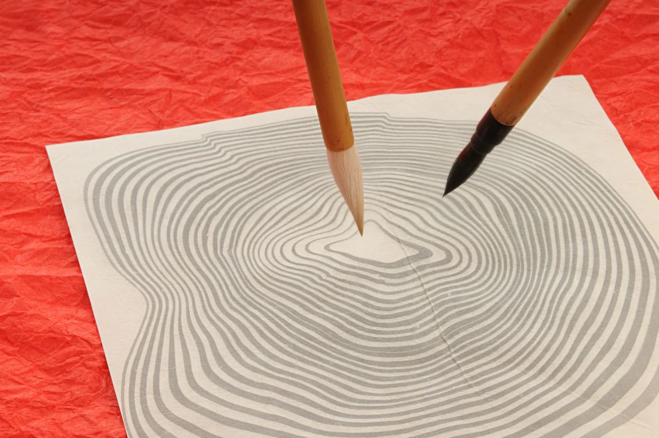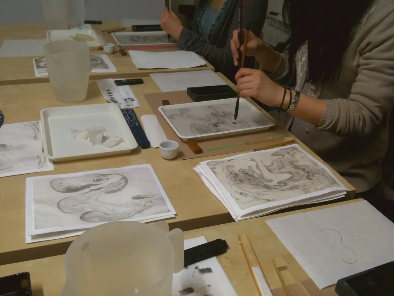 Ci si prepara in silenzio ponendo attenzione al proprio respiro e si comincia a “macinare” il bastoncino di sumi nella pietra inumidita fino a formare un liquido di colore nero, profumato di resina, vellutato: l’inchiostro. In una vaschetta si versa acqua purissima, la si lascia acquietare e con la punta del pennello intinta nell’inchiostro si tocca la superficie. La minuscola goccia nera, essendo formata da polvere di carbone più leggera dell’acqua, galleggia perfettamente espandendosi in un cerchio perfetto.