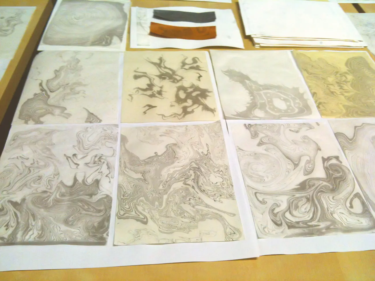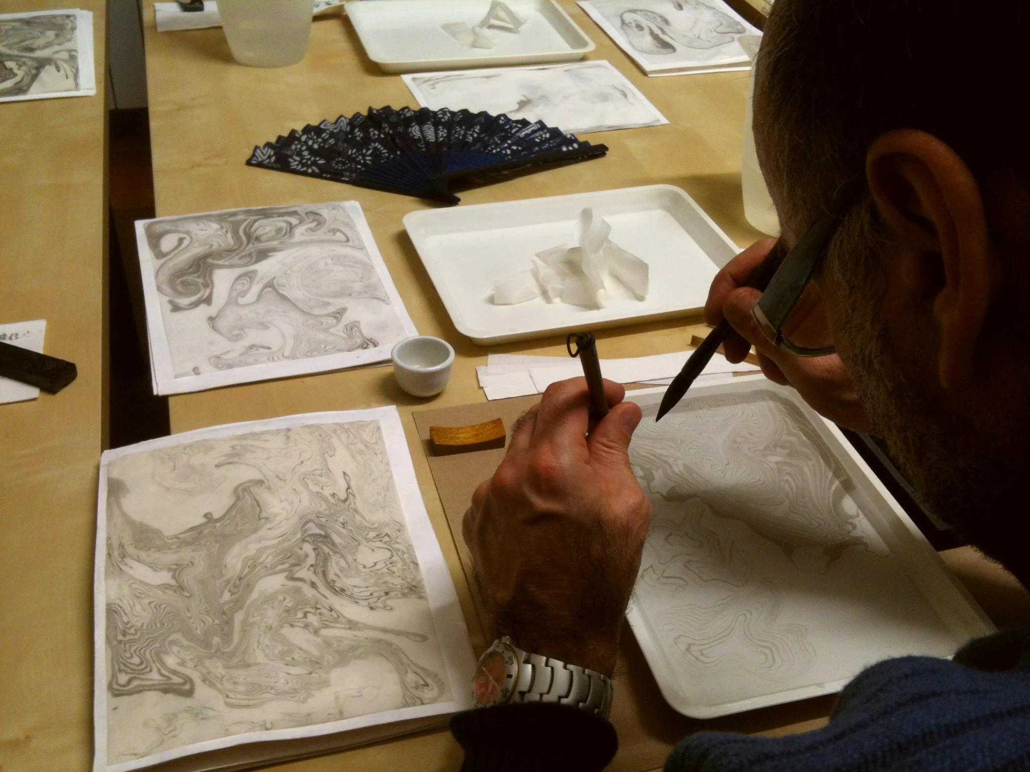 Il fascino del suminagashi si risolve comunque in una tecnica relativamente facile da apprendere, ma se ci si interroga sulle sue origini si scopre presto che la sua storia millenaria è avvolta nel mistero. In Giappone le tecniche artigianali e artistiche venivano insegnate direttamente da maestro ad allievo e questo spiega l’assenza di manuali o libri di testo. Un breve capitolo sull’argomento lo si trova in un libro sulla fabbricazione della carta giapponese, A Life of Ts’ai Lung and Japanese Paper-Making di Kiyofusa Narita, in quel tempo direttore del Museo della carta di Tokyo, pubblicato nel 1954 dallo stesso museo. Narita vorrebbe raccontare del suminagashi, ma ammette di saperne pochissimo, nessuno ha mai scritto degli inchiostri fluttuanti. Cenni sparsi in testi di storia, arte, religione, tecniche decorative, ma mai un testo specifico e soprattutto completo.